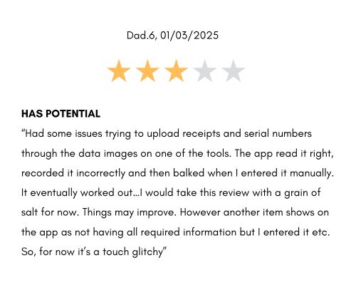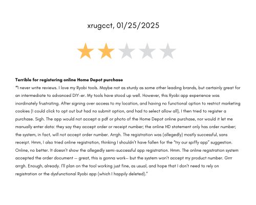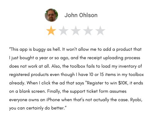 Among the complaints, most negative reviews revolved around issues with registering RYOBI tools. Some people were unable to do so on the app. Others had success registering them online but the tools wouldn’t display in their browser, which led them to re-register the tools and caused those people to have duplicates in their RYOBI app toolboxes.